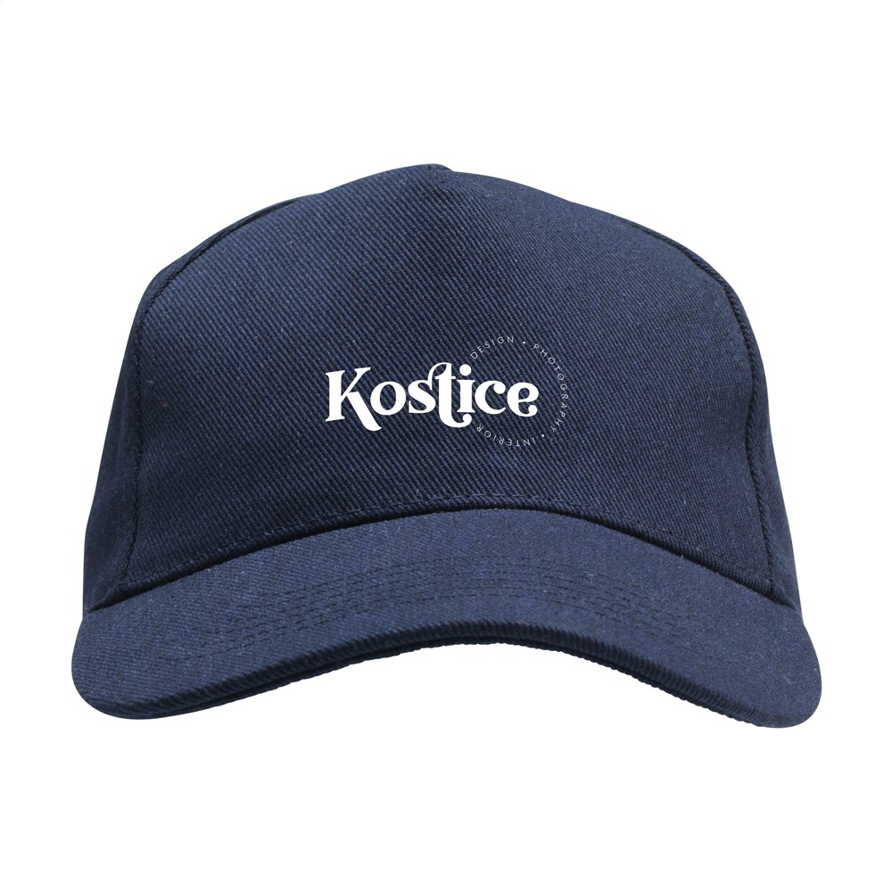 Comfortable cap made from extra heavy quality material: 60% recycled cotton and 40% recycled polyester. With a preformed peak and adjustable metal clip closure at the back, this 5-panel cap has a curved visor and embroidered eyelets for ventilation.