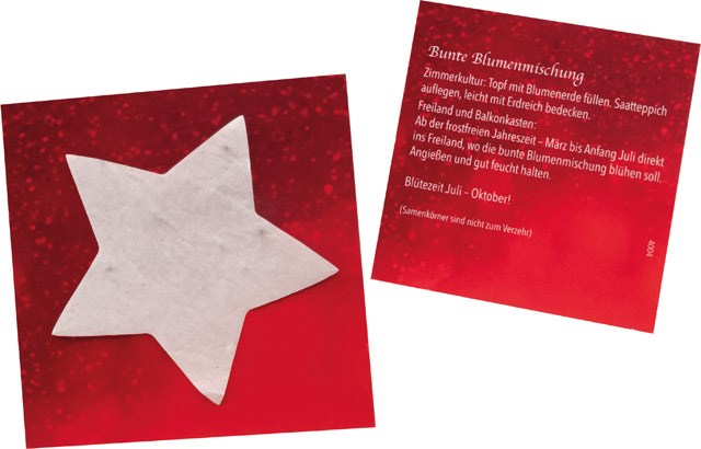 A star that can also grow in the cold season. Simply place the seed paper on the soil and water. The first green tips will soon be visible. You may use the card for your advertising. Your personalisation starts as well with 250 pieces. Content: seed paper star Ø 60 mm, seeds: summer flowers