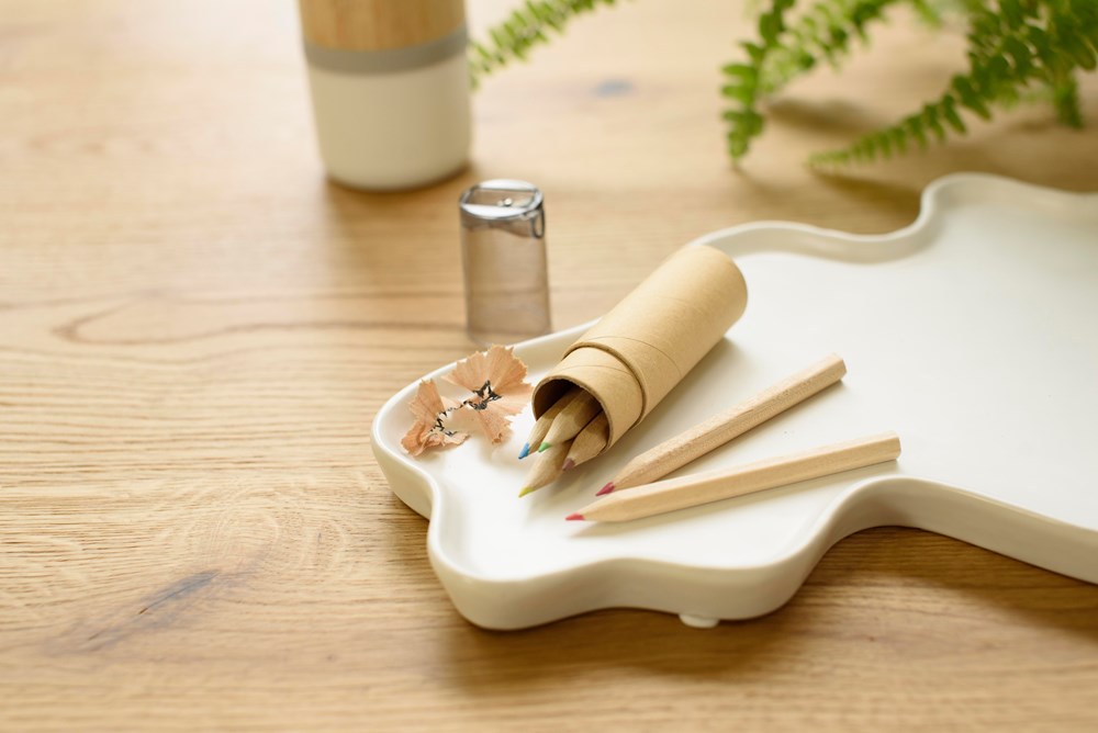 Cardboard and ABS tube with six colored pencils and sharpener integrated in the lid.