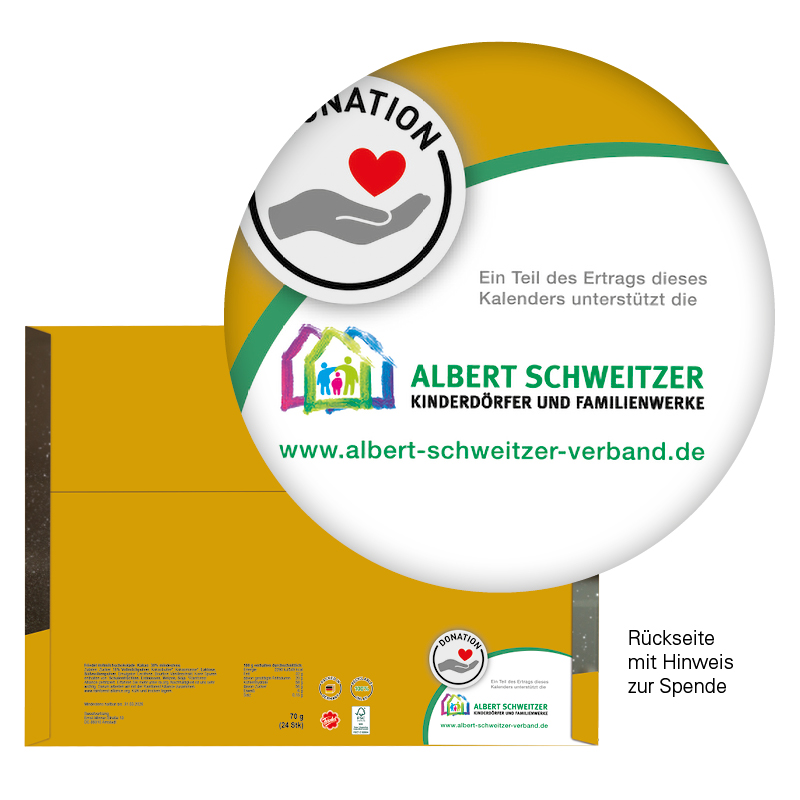 Wall advent calendar, portrait format, solid cardboard cover made of grass paper, individually printed, Inlay recyclable. Part of the proceeds from this calendar supports the "Albert Schweitzer Kinderdoerfer and Familienwerke". Content: 24 Friedel mini chocolate bars, 70 g Product box containing 25 pieces, 4 product boxes per shipping box (portrait or landscape format) -Shipping in Germany as a postage-friendly format Seasonal article - while stocks last!