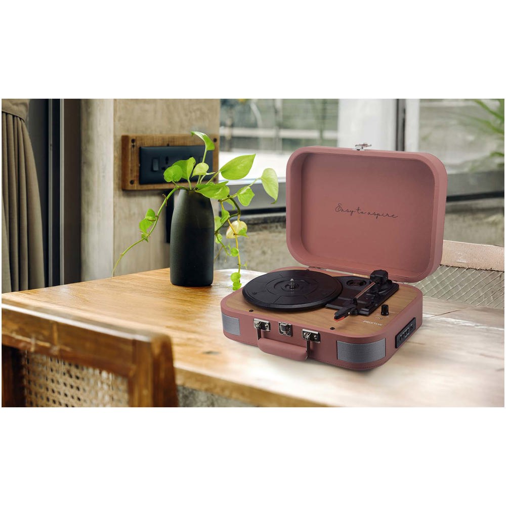 Vinyl turntable and music player with Bluetooth® 5.0, USB, TF and FM Radio. Digitize vinyl to WAV format via USB input and TF slot. It has RCA audio output and is delivered with a pair of headphones. It includes a ruby needle to play records delicately. Designed in the shape of a briefcase. The turntable can be linked with a mobile device via Bluetooth® to use the speaker function.