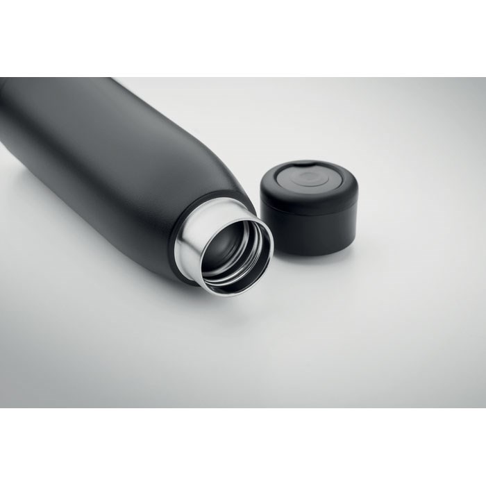 Double wall recycled stainless steel (90% recycled stainless steel and 10% stainless steel) bottle with soft silicone carry ring lid. By simply shaking the bottle surface temperature changes to heating or cooling, depends on liquid inside. Leak-free. Capacity: 400 ml.