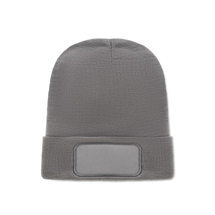 Unisex knitted beanie in soft stretchable RPET polyester with cuff and patch.