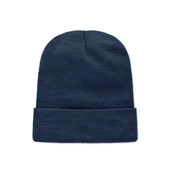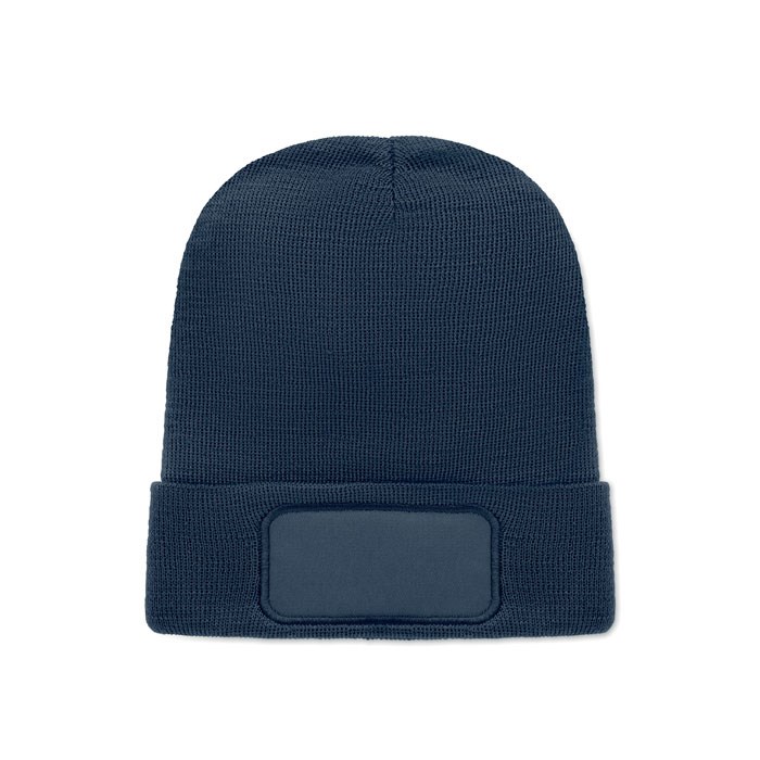Unisex knitted beanie in soft stretchable RPET polyester with cuff and patch.