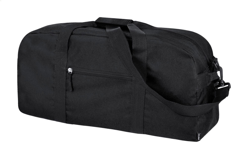 RPET sports bag with zipped main compartments and front pocket, adjustable shoulder strap. 600D RPET polyester, with distinctive RPET label.