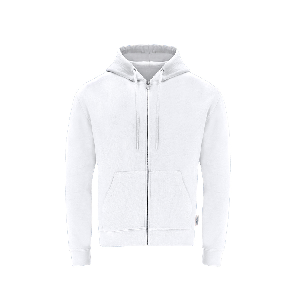 Unisex hooded sweatshirt with zip in Organic Cotton and Recycled Polyester, in soft 280 g/m2 quilted fleece. With double layer lined hood, adjustable round drawstrings - with matching stoppers - and metal eyelets. Elastane ribbed cuffs and waistband, and front kangaroo pocket. Hidden metal zip opening, with reinforced seam cover on collar. Including distinctive eco label.