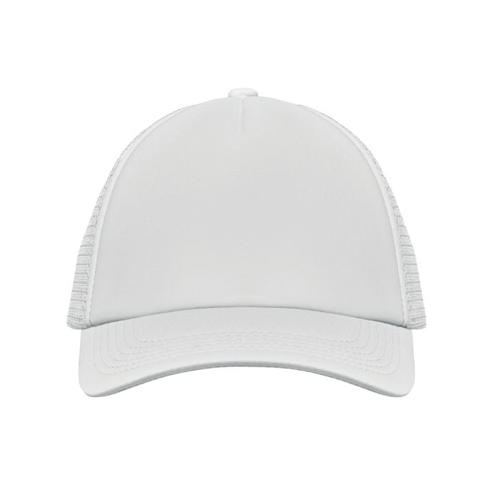5 panel truckers cap in polyester 140-150 gr/m² with adjustment plastic snap closure. White front panel and color visor in polyester jersey with foam backing. Other panels in color mesh. Size 7 1/4.