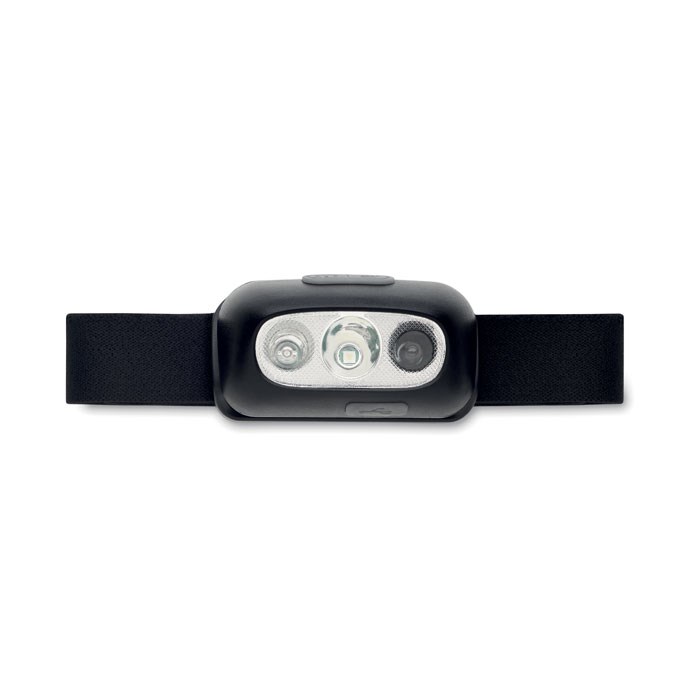 Rechargeable and adjustable head torch with 1 LED light (50 lumen) and 3 lightning modes. Built in 400 mAh rechargeable battery and including charging cable.