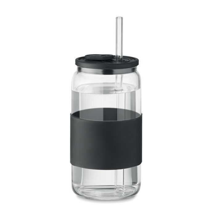 High borosilicate glass tumbler with silicone lid and grip. Includes borosilicate glass straw. Capacity : 550 ml.