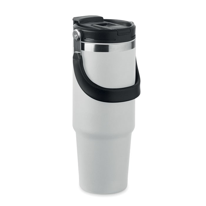 Double wall recycled stainless steel (90% recycled stainless steel and 10% stainless steel) tumbler with lid with inner straw, foldable mouth piece and direct drinking opening . Capacity 850 ml.