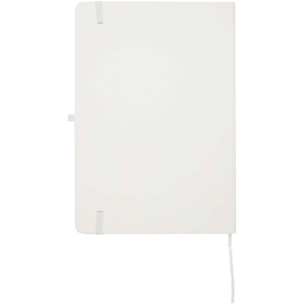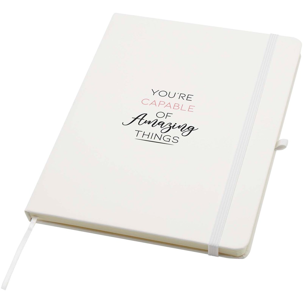 The Spectrum Plus A5 hard cover notebook with rounded corners is not only an office essential but also a great opportunity to promote your brand. The cardboard notebook has a soft-feel cover and 80 lined cream coloured sheets of 70 g/m², ideal for writing down quick ideas or long notes. The notebook has a pen loop, elastic closure, ribbon marker and accordion pocket.