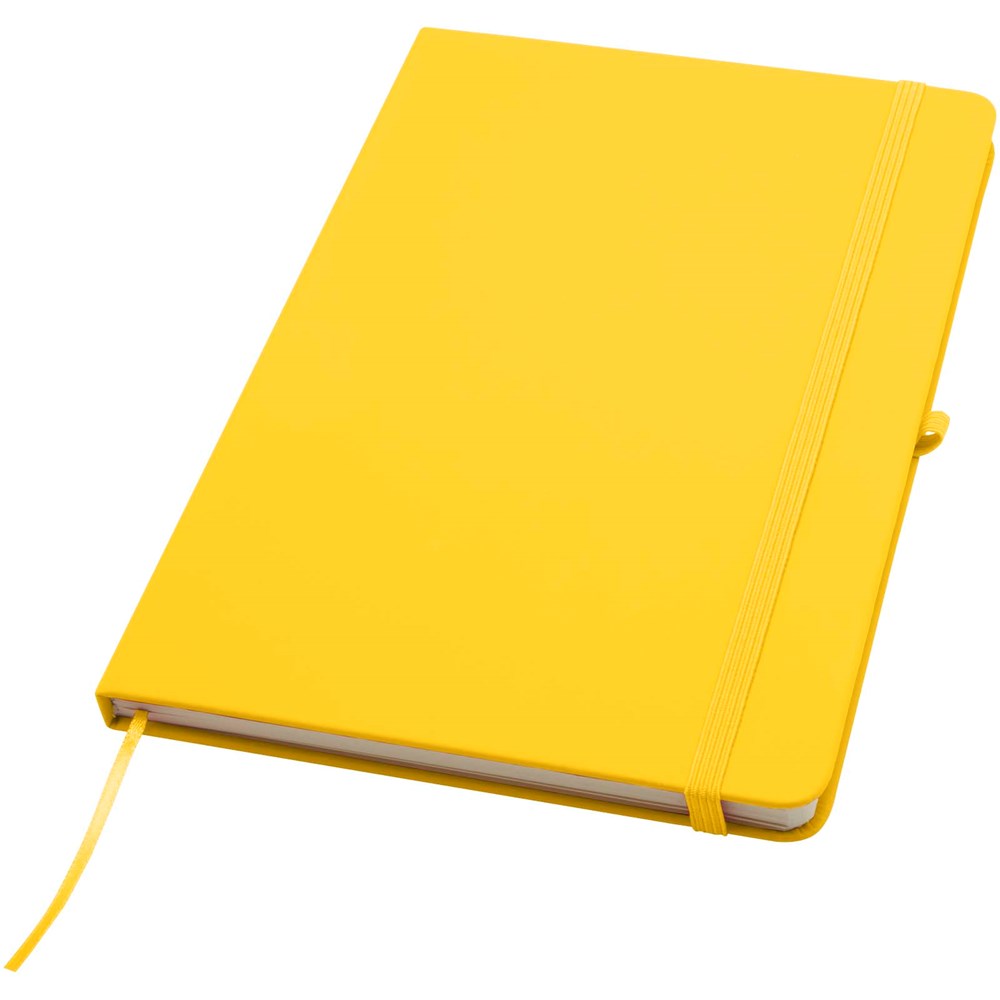 The Spectrum Plus A5 hard cover notebook with rounded corners is not only an office essential but also a great opportunity to promote your brand. The cardboard notebook has a soft-feel cover and 80 lined cream coloured sheets of 70 g/m², ideal for writing down quick ideas or long notes. The notebook has a pen loop, elastic closure, ribbon marker and accordion pocket.