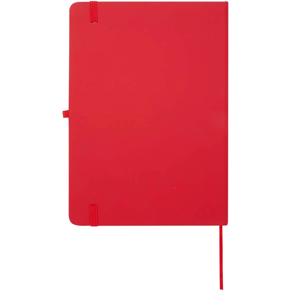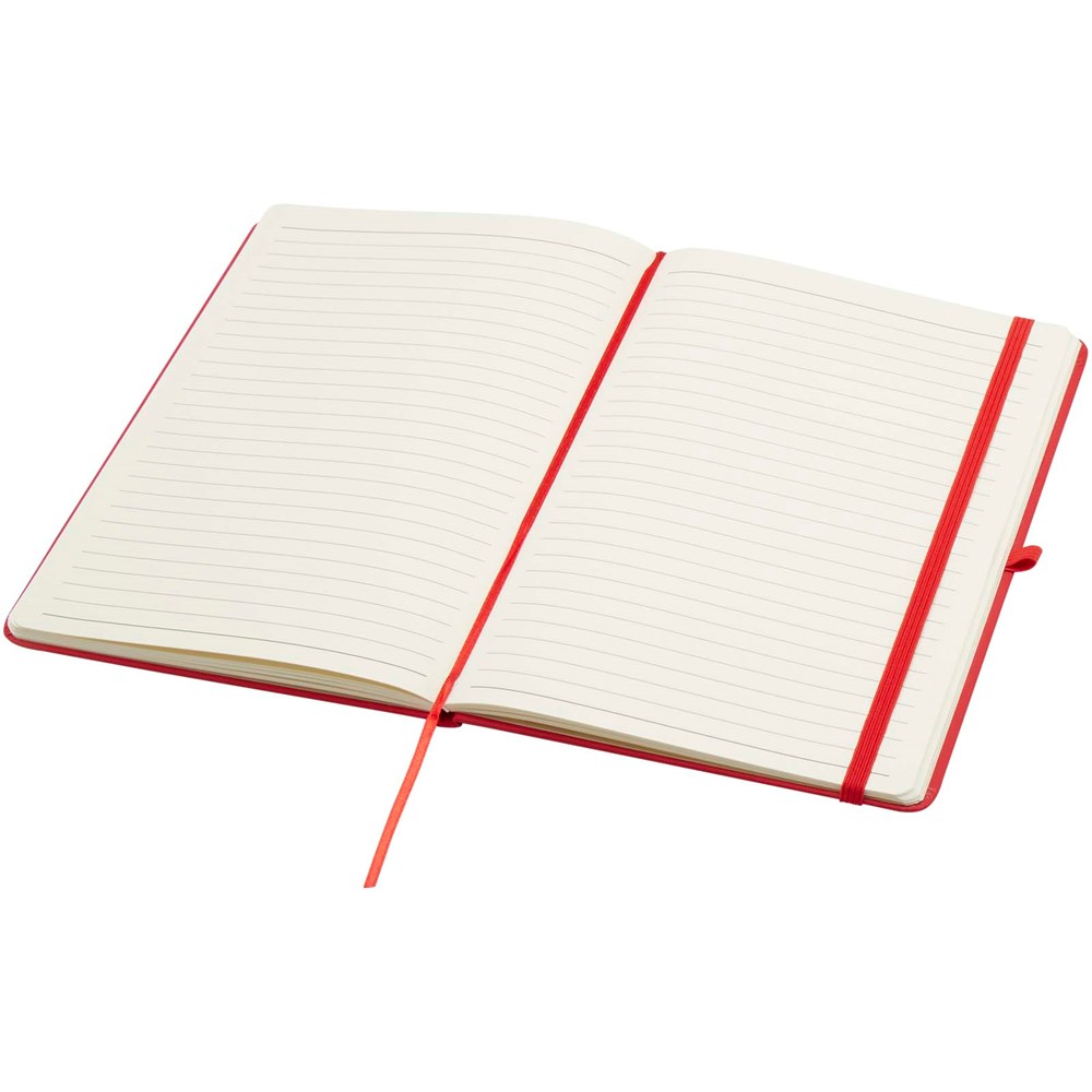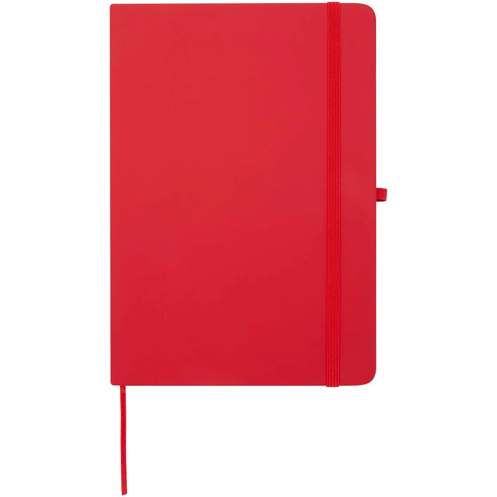 The Spectrum Plus A5 hard cover notebook with rounded corners is not only an office essential but also a great opportunity to promote your brand. The cardboard notebook has a soft-feel cover and 80 lined cream coloured sheets of 70 g/m², ideal for writing down quick ideas or long notes. The notebook has a pen loop, elastic closure, ribbon marker and accordion pocket.