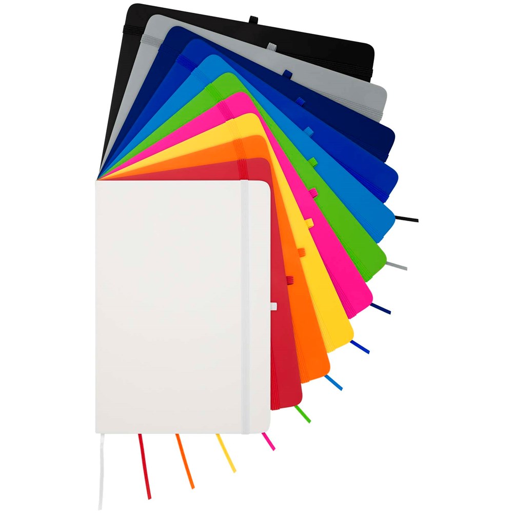 The Spectrum Plus A5 hard cover notebook with rounded corners is not only an office essential but also a great opportunity to promote your brand. The cardboard notebook has a soft-feel cover and 80 lined cream coloured sheets of 70 g/m², ideal for writing down quick ideas or long notes. The notebook has a pen loop, elastic closure, ribbon marker and accordion pocket.