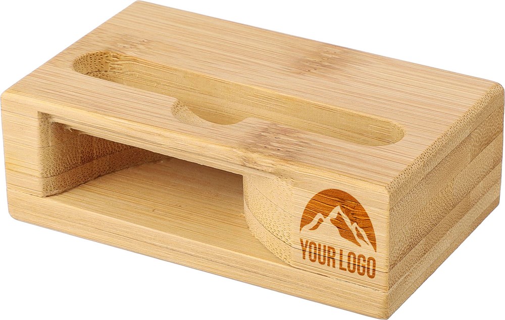 Bamboo phone stand with sound amplifier function. When playing music, the sound is amplified through the bottom without the need for power or batteries. Phone slot dimensions: approx. 8.2 x 1.2 cm. Individually packaged in a brown cardboard box.