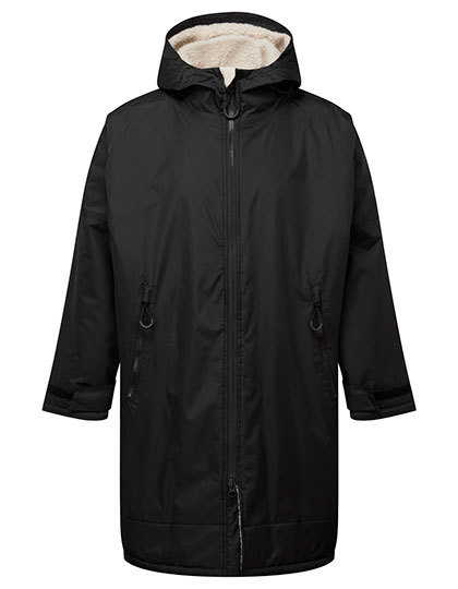 Unisex | Oversized | Full-length two way plastic zip with easy pull toggles | Chin guard | Oversized fit | Side vents | Adjustable cuffs with hook and loop fastening | Side zip pockets | Inside pocket with zip on left side | Inside patch pocket on right side | 3-panelled hood | Loop on centre back of jacket for hanging the robe | Dropped back hemline | Embroidery access to back, chest area can be accessed also through here | Waterproof taped seamed outer layer | Sherpa fleece interior | Rebrandle stuff sack carry bag with double drawstring straps