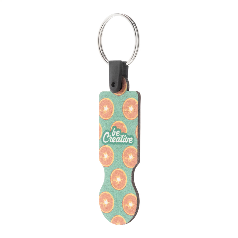 Plywood shopping trolley coin keyring with full colour graphics. Price includes UV LED printing on one side. MOQ: 200 pcs.