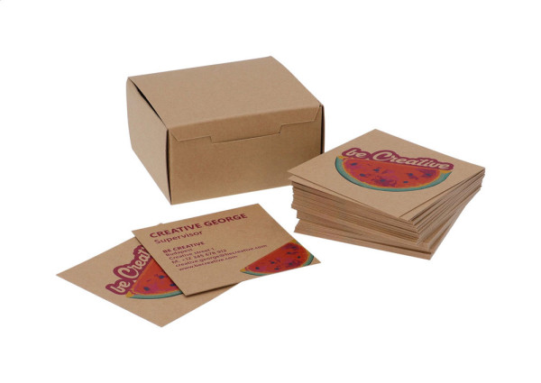 100 pcs custom made, square shaped business cards with full colour printed graphics on both sides. Matte kraft paper, 300 g/m². In kraft paper box.