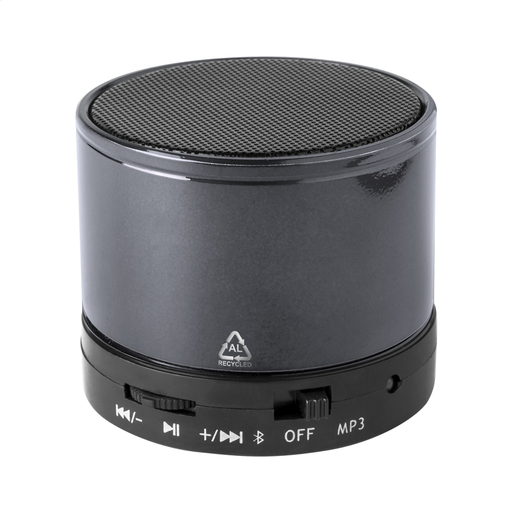 Wireless speaker in recycled aluminium and recycled ABS housing. With radio, MP3 player, hands-free call function and built-in rechargeable battery (300 mAh). Including USB charger and aux-in cable.