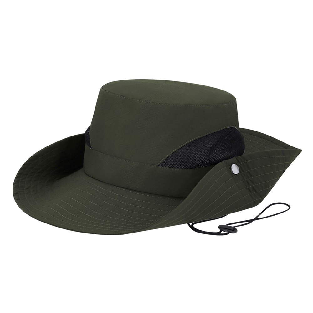 Safari-style hat made from durable polyester material. Comfortable interior, with refreshing side ventilation mesh made from breathable fabric. Adjustable brim with metal button closures and adjustable carrying cord.