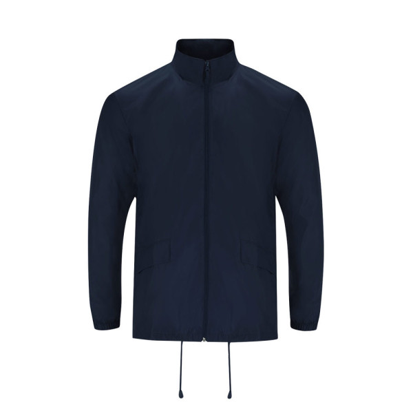 Unisex high-neck rain jacket with detachable hood. The hood features adjustable drawstrings for a personalised fit and Velcro fastening for easy folding and storage. The interior is lined with a silver coating for added protection. Includes a central zip fastening with a tone-on-tone puller, two side pockets with flaps, elasticated cuffs for a comfortable fit, and an adjustable hem with inner drawstrings for extra customisation. An elastic band inside one of the pockets allows the jacket to be conveniently folded and stored when not in use.