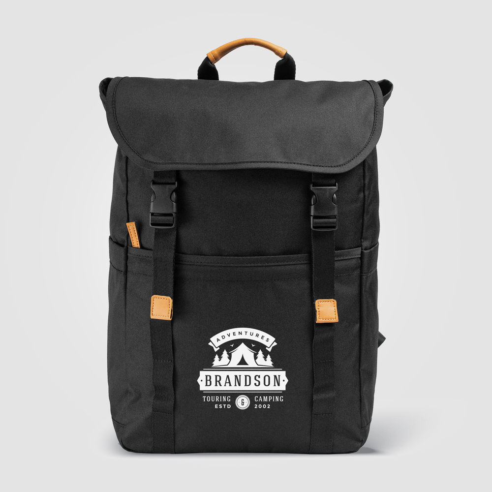 The Lund Backpack combines style and functionality. Crafted from durable 600D rPET polyester with a 210D lining, it features a spacious main compartment with a padded sleeve for laptops including 13" (33 cm), 14" (35.6 cm), 15" (38.1 cm), 16" (40.6 cm), and 17" (43.2 cm), a zipped front pocket, and two side pockets. It includes a trolley strap, padded adjustable shoulder straps, and a top handle with PU accents.