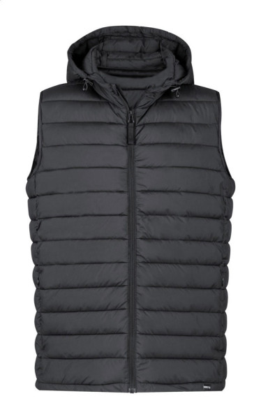 Wind and water resistant, zipped bodywarmer vest with zipped side pockets and adjustable hood. With RPET polyester pouch. 100% RPET polyester with distinctive RPET label.