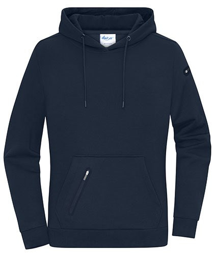 High-quality interlock fabric | Pleasant blend of organic cotton, recycled polyester and elastane | Technical details | Kangaroo pocket with additional zipped pocket | Zipped pocket on left sleeve | Zipped pockets bordered with fashionable tape | Slightly fitted