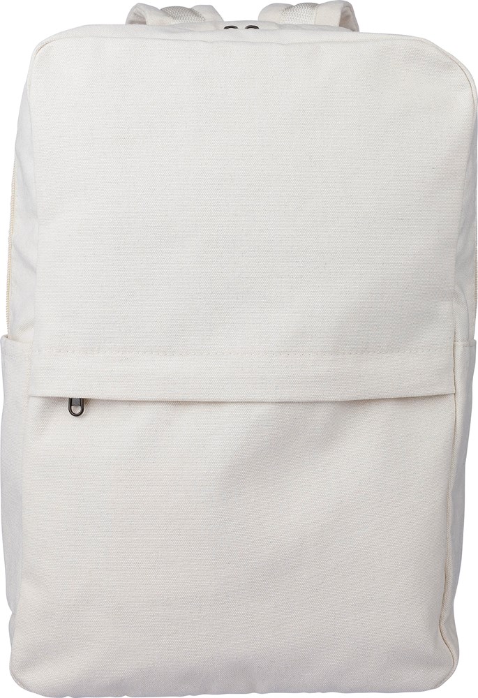Recycled polycotton (330 gsm) backpack with a 210D polyester lining. Features a large zippered compartment with a padded 15-inch laptop compartment, two inner compartments, and two outer compartments, including a side compartment and a small zippered front pocket. The design includes padded adjustable carrying straps and a handle. Capacity: 14L. Carrying capacity: 13 kg. Includes a label.