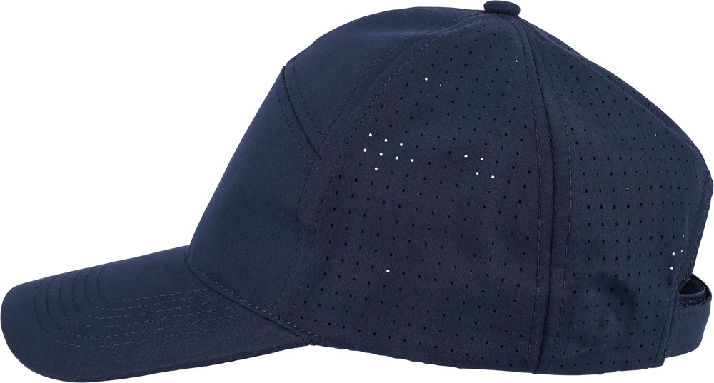 Polyester cap with laser-cut ventilation holes on the back panels. Features a 7-panel design with one panel at the front and a 7 cm visor. Adjustable and breathable, without a PU label.