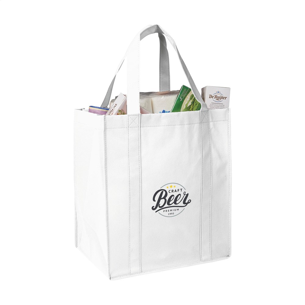 Practical, extra spacious shopping bag made from recycled non-woven polyester (80 g/m²). Strong and super light. With a reinforced bottom, carrying loops and an extra hanging loop on the inside. GRS-certified. Total recycled material: 94%. Capacity approx. 31 litres.