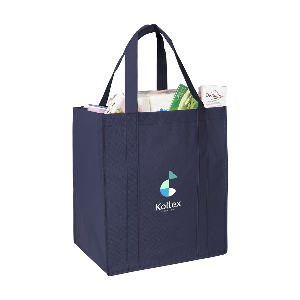 Practical, extra spacious shopping bag made from recycled non-woven polyester (80 g/m²). Strong and super light. With a reinforced bottom, carrying loops and an extra hanging loop on the inside. GRS-certified. Total recycled material: 94%. Capacity approx. 31 litres.