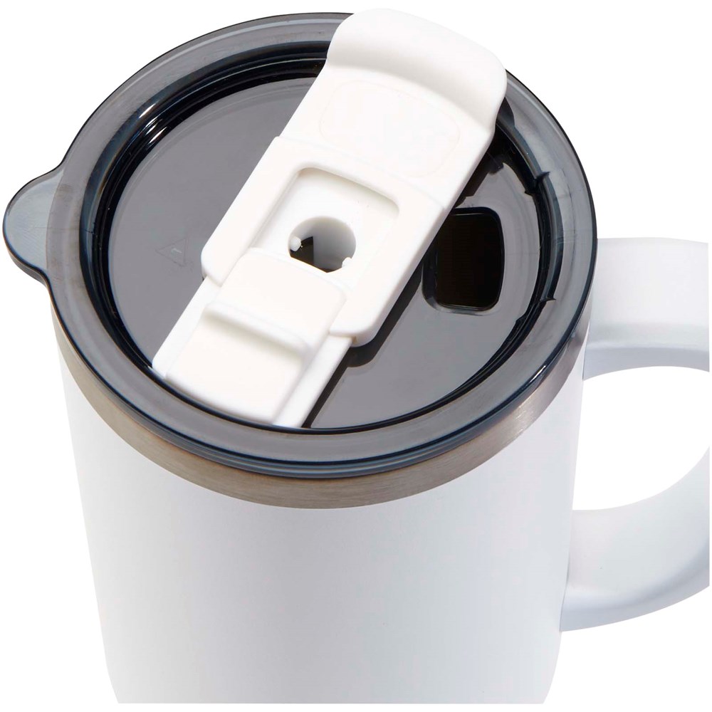RCS certified double walled copper vacuum insulated tumbler, constructed using 91% post-consumer recycled stainless steel that will keep drinks cold for at least 24 hours, or hot for 9 hours. Features a Tritan straw, and a lid slider function to prevent spills. The 100% recycled plastic press-on swivel lid securely holds the straw in place, and can easily be rotated to expose the drink opening. Durable exterior powder coating. Volume capacity: 1200 ml. Hand wash only.