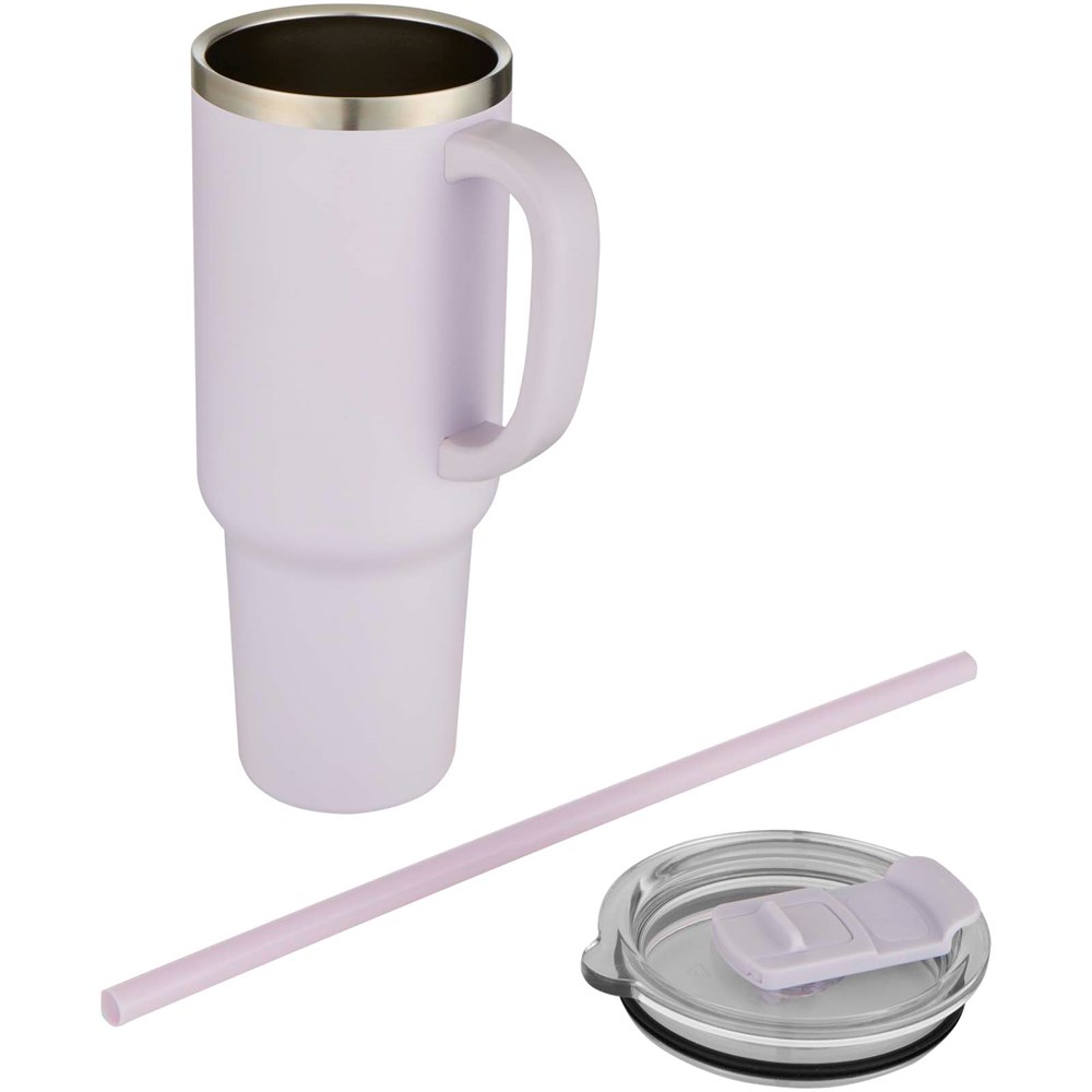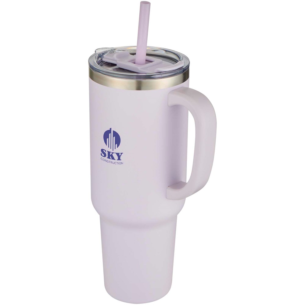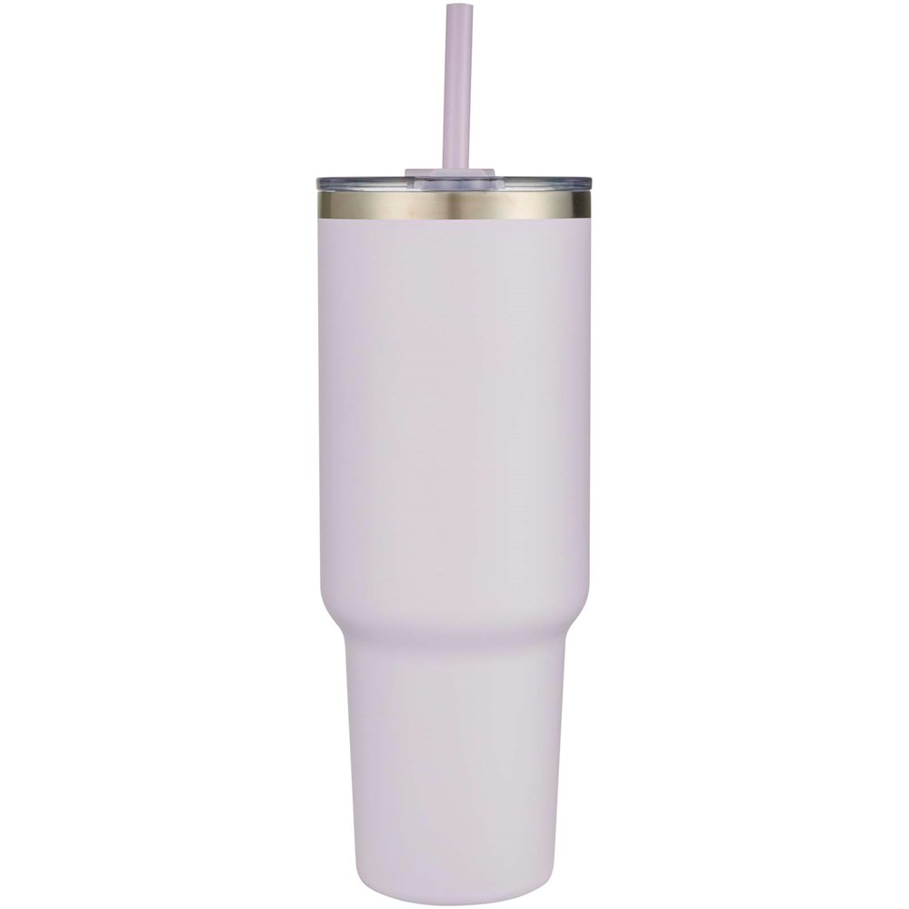 RCS certified double walled copper vacuum insulated tumbler, constructed using 91% post-consumer recycled stainless steel that will keep drinks cold for at least 24 hours, or hot for 9 hours. Features a Tritan straw, and a lid slider function to prevent spills. The 100% recycled plastic press-on swivel lid securely holds the straw in place, and can easily be rotated to expose the drink opening. Durable exterior powder coating. Volume capacity: 1200 ml. Hand wash only.