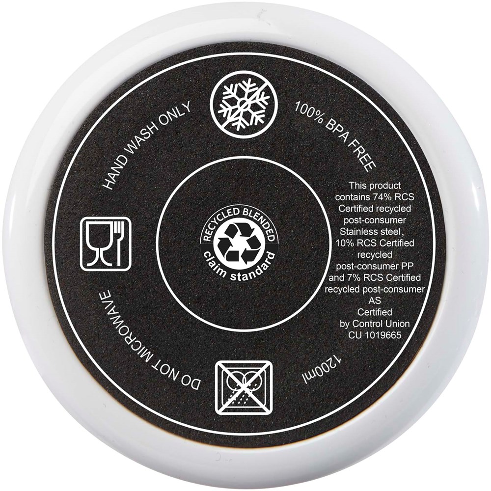 The Melbourne tumbler features double-wall air insulation, keeping drinks hot for up to 2 hours and cold for up to 4 hours. The inner wall of the tumbler is made from recycled plastic and the outer wall is made from RCS-certified recycled stainless steel. The tumbler holds 1200 ml so you can stay hydrated in style all day long. Features a splash-proof dual-vent lid with a twist-lock cap. Comes with a food-grade recycled straw. Hand wash only.
