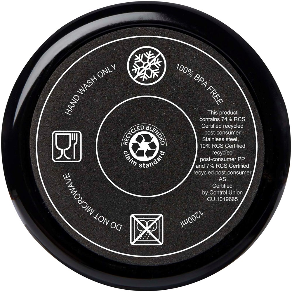 The Melbourne tumbler features double-wall air insulation, keeping drinks hot for up to 2 hours and cold for up to 4 hours. The inner wall of the tumbler is made from recycled plastic and the outer wall is made from RCS-certified recycled stainless steel. The tumbler holds 1200 ml so you can stay hydrated in style all day long. Features a splash-proof dual-vent lid with a twist-lock cap. Comes with a food-grade recycled straw. Hand wash only.