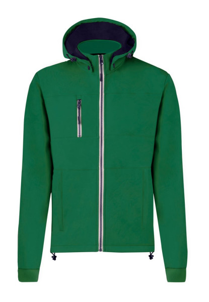 Wind and waterproof, zipped softshell jacket with 2 side pockets, 1 front pocket, stand-up collar and detachable hood. 100% polyester, 300 g/m².