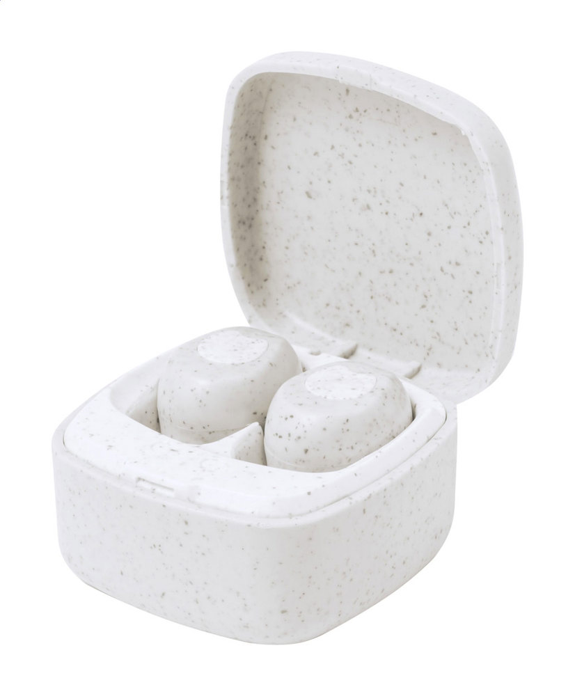 Ecological wheat straw plastic, true wireless stereo (TWS) earphones with hands-free call function in charger case. Including USB charger cable.