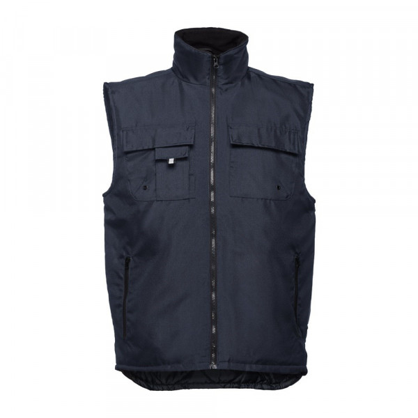 Men's padded work vest in 100% oxford polyester with an acrylic coating (170 g/m²), lined in 100% taffeta polyester (65 g/m²). Fleece lined collar and elastic sides for better fit. Contains 6 pockets: 5 front pockets, including 2 with inner zip plus 1 for mobile phone, and 1 inside pocket. Zipped access at the back for easy customisation. Sizes: S, M, L, XL, XXL, 3XL