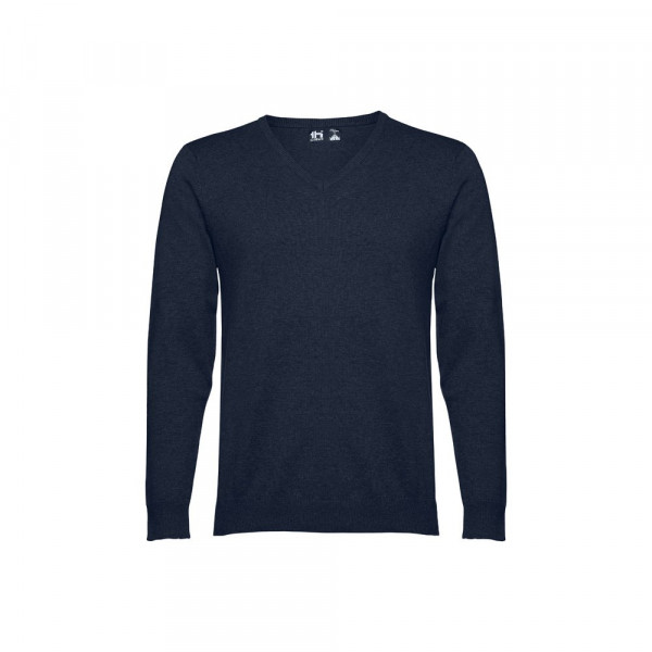 Pullover with "V" neckline for men 70% cotton and 30% polyamide (220 g/m²). Features a collar, cuffs and lower part in rib and inset sleeves Sizes: S, M, L, XL, XXL