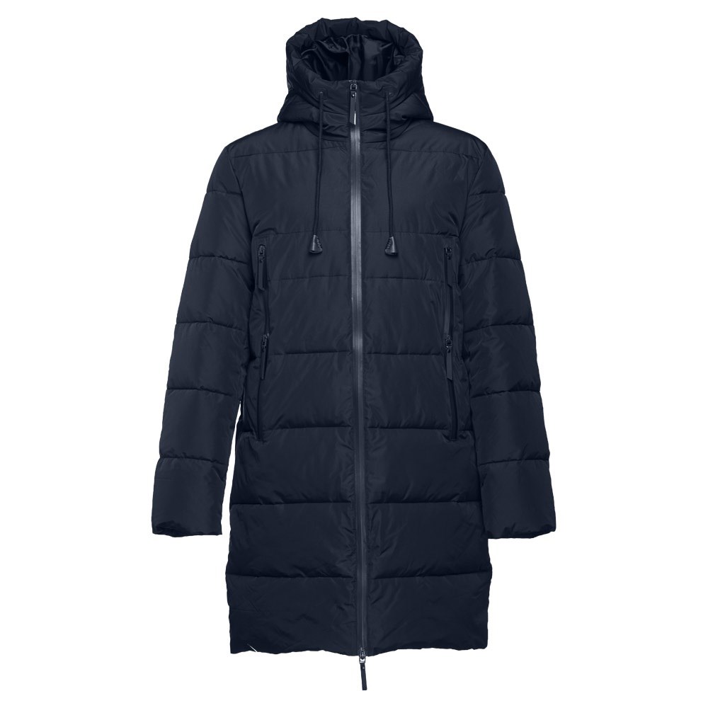 Long padded parka (unisex) in 100% polyester (exterior: 75 g/m² 300T polyester pongee coating, interior: 100% polyester 50 g/m², filling: 335g/m²). With lined and padded hood and elastic cuffs. Warm and sturdy parka with decorative topstitching, with interior and front pockets with waterproof zippers. Sizes: S, M, L, XL, XXL