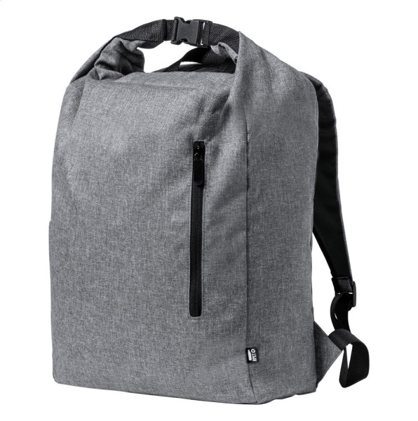 Waterproof, rolltop backpack in RPET with side pocket, zipped front pocket, padded back and shoulder straps. With distinctive RPET label. 300D RPET polyester.