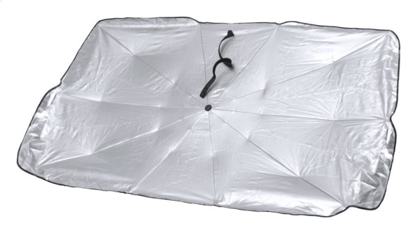 Foldable car sunshade umbrella for windshield with metal frame. In polyester pouch.