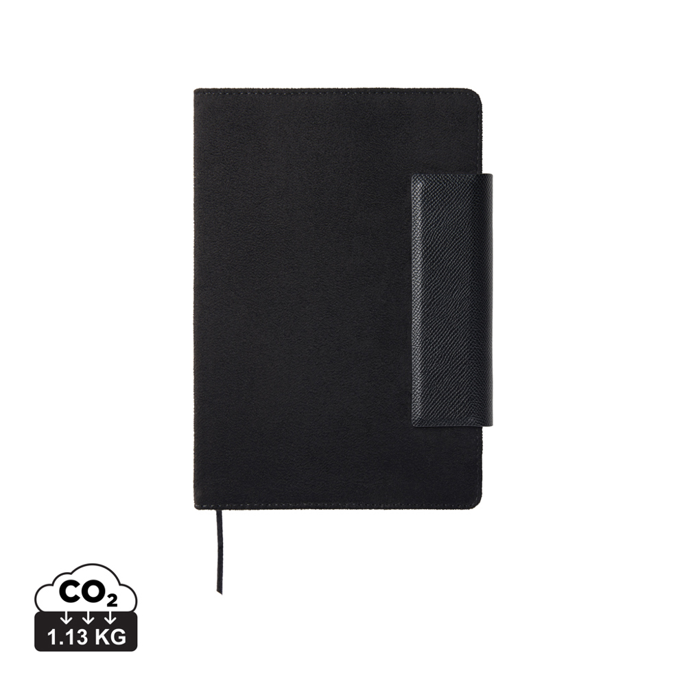 A stylish A5 notebook consisting of 160 lined pages (80 sheets). It is the perfect accessory to bring to meetings, keeping your notes organised in style. Marlow notebook combines timeless design with recycled faux leather, PU details and recycled paper. The notebook is equipped with a practical and stylish magnetic closure. Certified by GRS (Global Recycled Standard), GRS certification guarantees that the entire supply chain of the recycled materials is certified. The total recycled content is based on the overall product weight. This product contains 50% GRS certified recycled paper and 6% GRS certified recycled polyester.
