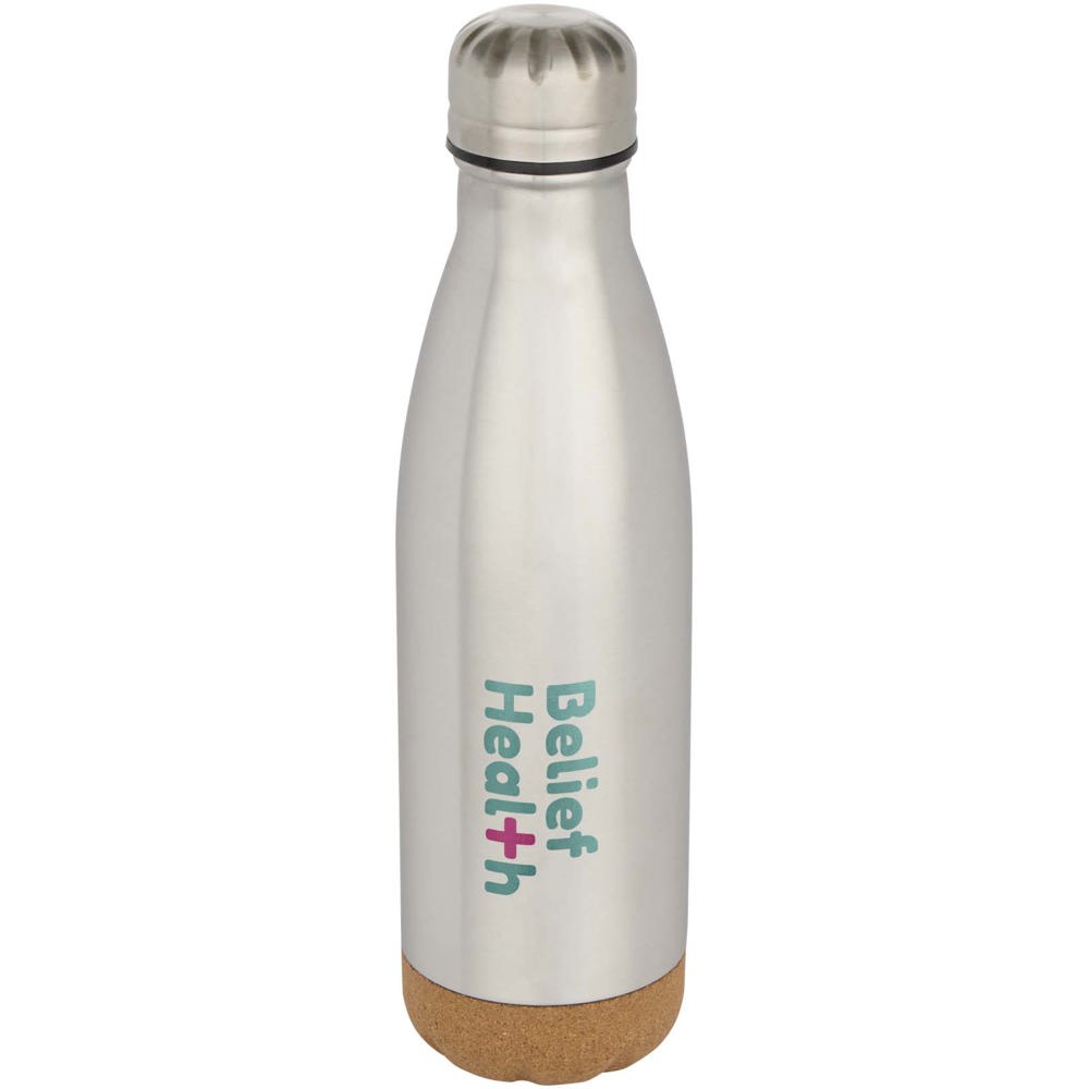 Vacuum insulated stainless steel water bottle with cork details at the bottom. The double-wall insulation keeps drinks hot for 12 hours and cold for 48 hours. Presented in a recycled cardboard gift box. Volume capacity: 500 ml.