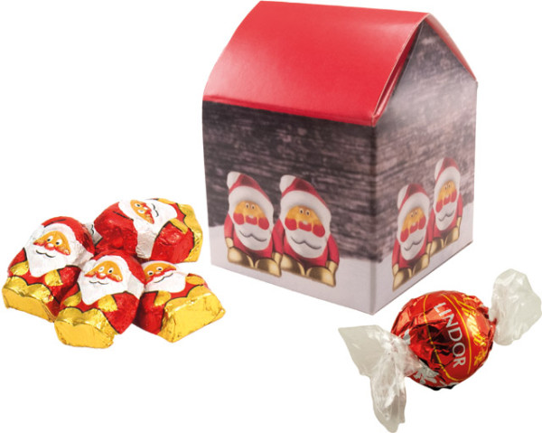 Our sweet little Christmas house is ideal as a giveaway for advent time. The Lindt chocolate ball and chocolate Santas are always welcome. Your advertising message can be placed in the standard design. Your personalisation of the house starts as well with 250 pieces.