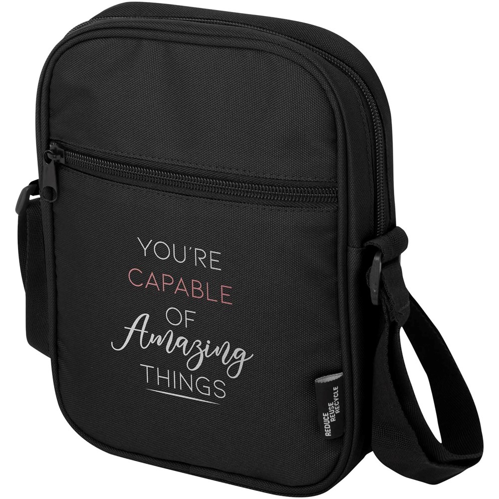 Practical and water-repellent crossbody bag made of GRS recycled polyester. It features a zipped compartment with a sleeve pocket inside to keep your everyday gadgets safely in place, a zipped front pocket for keys and valuable accessories, and an open sleeve pocket on the back for quick storage and access. With its adjustable high quality shoulder straps, the Byron crossbody bag is a perfect bag for everyday use with a minimal ecological footprint. PVC free.