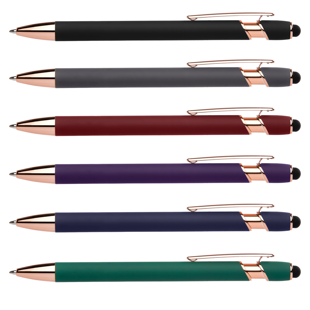 The Prince Softy Rose Gold w/ Stylus is a stylish, premium pen with trendy rose gold trim, available in your choice of black or blue medium ballpoint ink. Available in a range of top-selling classic barrel colours, all with rubberized soft touch finish plus a stylus that's perfect for touchscreens. Our precise silver laser engraving will showcase your company name, logo or advertising information. This beautiful promotional pen will be a favourite of your customers!