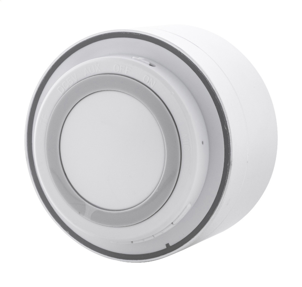 Recycled aluminium wireless speaker with metal mesh, LED light on the bottom and rechargeable battery (300 mAh). With hands-free call and micro SD MP3 playback functions. Including USB charger cable.