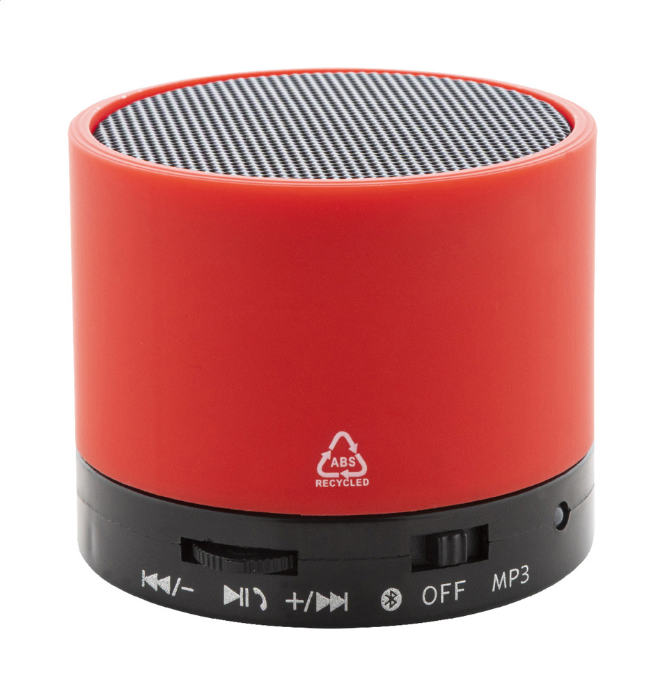 Recycled ABS wireless speaker in rubberized housing with metal mesh and rechargeable battery (300 mAh). With hands-free call and micro SD MP3 playback functions. Including USB charger cable.